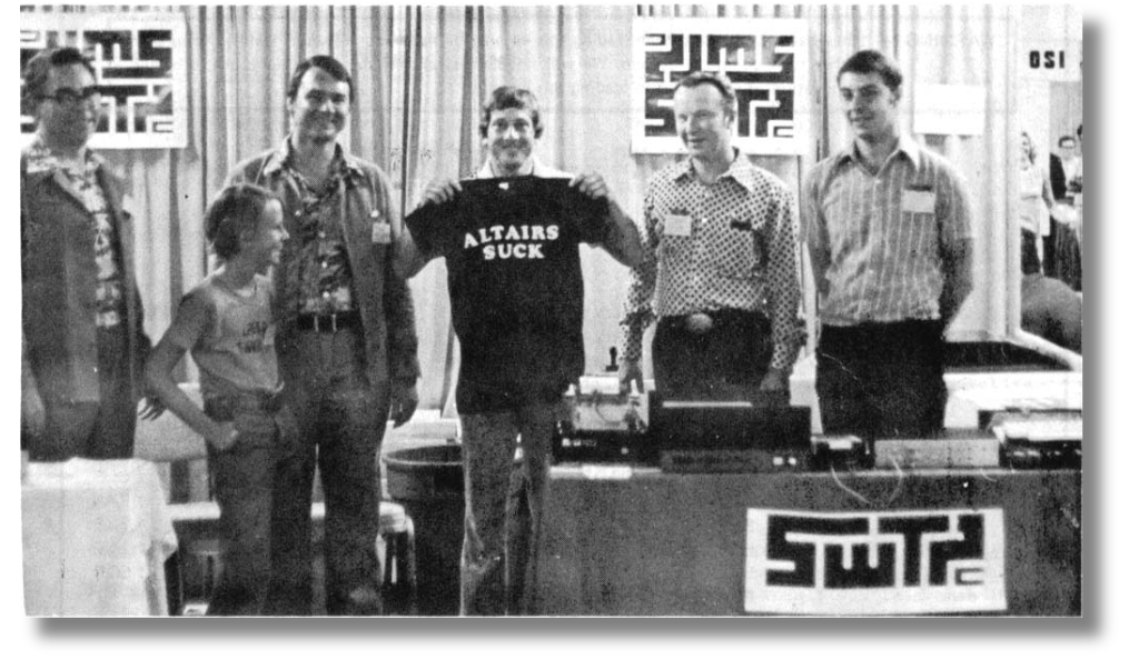 Robert Uiterwyk (third from the left, with his son to his right) came out of nowhere offering a BASIC interpreter for the SWTPC (see Robert Uiterwyk’s BASIC). He had purchased the computer for his son for Christmas, but became disillusioned because SWTPC’s own BASIC was still not available. So taking inspiration from Tiny BASIC, he wrote his own. And then followed up with a floating point BASIC sold by SWTPC.